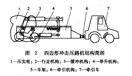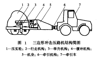 沖擊式壓路機(jī)主要依靠碾壓滾輪巨大的慣性沖擊來(lái)進(jìn)行壓實(shí),主要有異形碾壓輪、車(chē)架、緩沖機(jī)構(gòu)、牽引機(jī)構(gòu)、舉升機(jī)構(gòu)和行走機(jī)構(gòu)組成。如圖1,它是一種三邊性沖擊式壓路機(jī)結(jié)構(gòu)簡(jiǎn)圖。圖2所示的是一種四邊形沖擊式壓路機(jī)的結(jié)構(gòu)簡(jiǎn)圖。