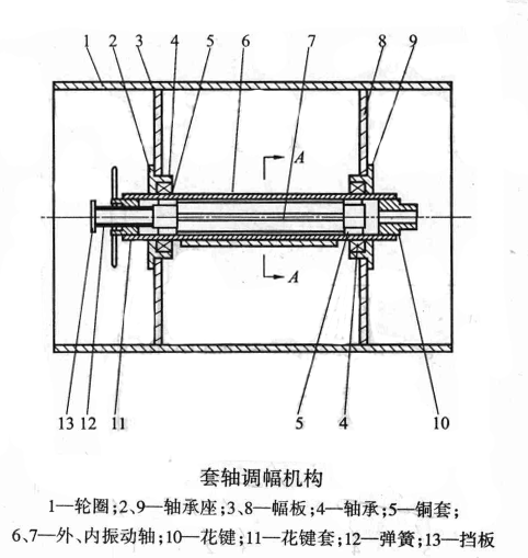 它是由鋼輪、振動軸(帶偏心塊)、中間軸減震器、連接板等組成。振動輪工作時(shí)通過改變振動軸的旋轉(zhuǎn)方向,使固定偏心塊與活動偏心塊方向一致或方向相反來改變振動軸的偏心質(zhì)量(偏心距),從而實(shí)現(xiàn)大振幅或小振幅,達(dá)到調(diào)幅的目的。偏心軸式振動輪可實(shí)現(xiàn)多級變幅,其偏心質(zhì)量分布在偏心軸全長度上,通過調(diào)整活動偏心好走與固定偏心軸(或偏心塊)的不同轉(zhuǎn)角,可得到不同的偏心力矩,從而實(shí)現(xiàn)調(diào)幅功能。常用的套軸調(diào)幅機(jī)構(gòu)如下圖所示。